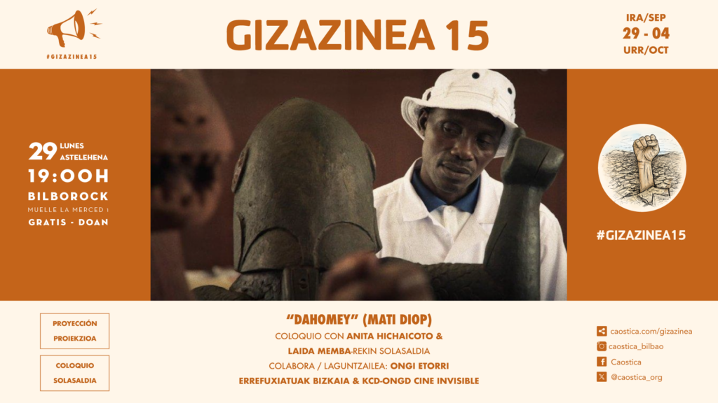 Proyección del largometraje documental ‘Dahomey’ (Mati Diop, 2024). Coloquio posterior con Anita Hichaicoto (investigadora, escritora, activista por los derechos humanos de la mujer en África) y Laida Memba (arquitecta, investigadora y comisaria). Actividad realizada en colaboración con Ongi Etorri Errefuxiatuak Bizkaia y KCD-ONGD Cine Invisible.